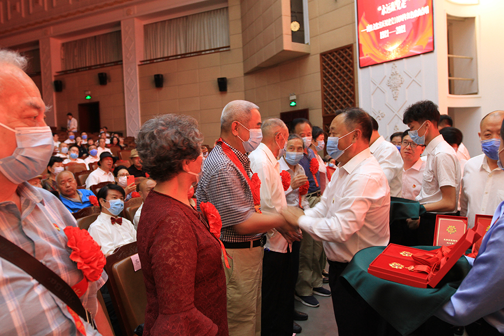 为隆重庆祝中国共产党成立100周年,深入推进党史学习教育,6月29日下午,民族文化宫举行仪式,颁发“光荣在党50年”纪念章,通报表彰在民族文化宫光荣工作30年的老干部老职工,表彰民族文化宫优秀共产党员、优秀党务工作者和先进党支部。宫领导班子成员、全体在职干部职工和受表彰的离退休老同志共270余人参加活动。