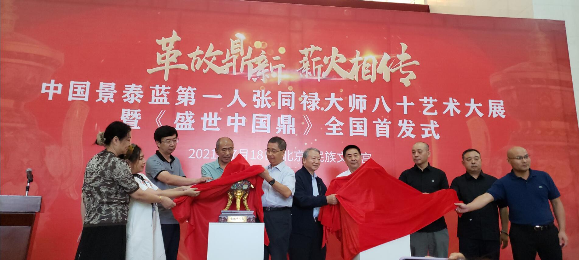 7月18日,由中国工艺美术协会、张同禄珐琅艺术中心共同主办的“革故鼎新·薪火相传——‘中国景泰蓝第一人’张同禄八十艺术大展暨《盛世中国鼎》全国首发式”在民族文化宫展览馆开幕。