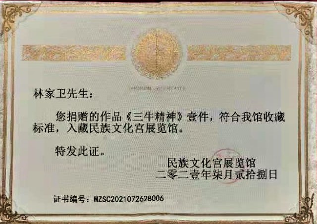 展览结束后,参展画家中国美术家协会会员林家卫将其创作的国画作品《三牛精神》捐赠给民族文化宫展览馆收藏。展览馆将不负重托,继续发扬“为民服务孺子牛、创新发展拓荒牛、艰苦奋斗老黄牛”精神,凝聚“九牛爬坡,个个出力”的奋斗合力,在新时代民族工作中展现新担当、实现新作为。
